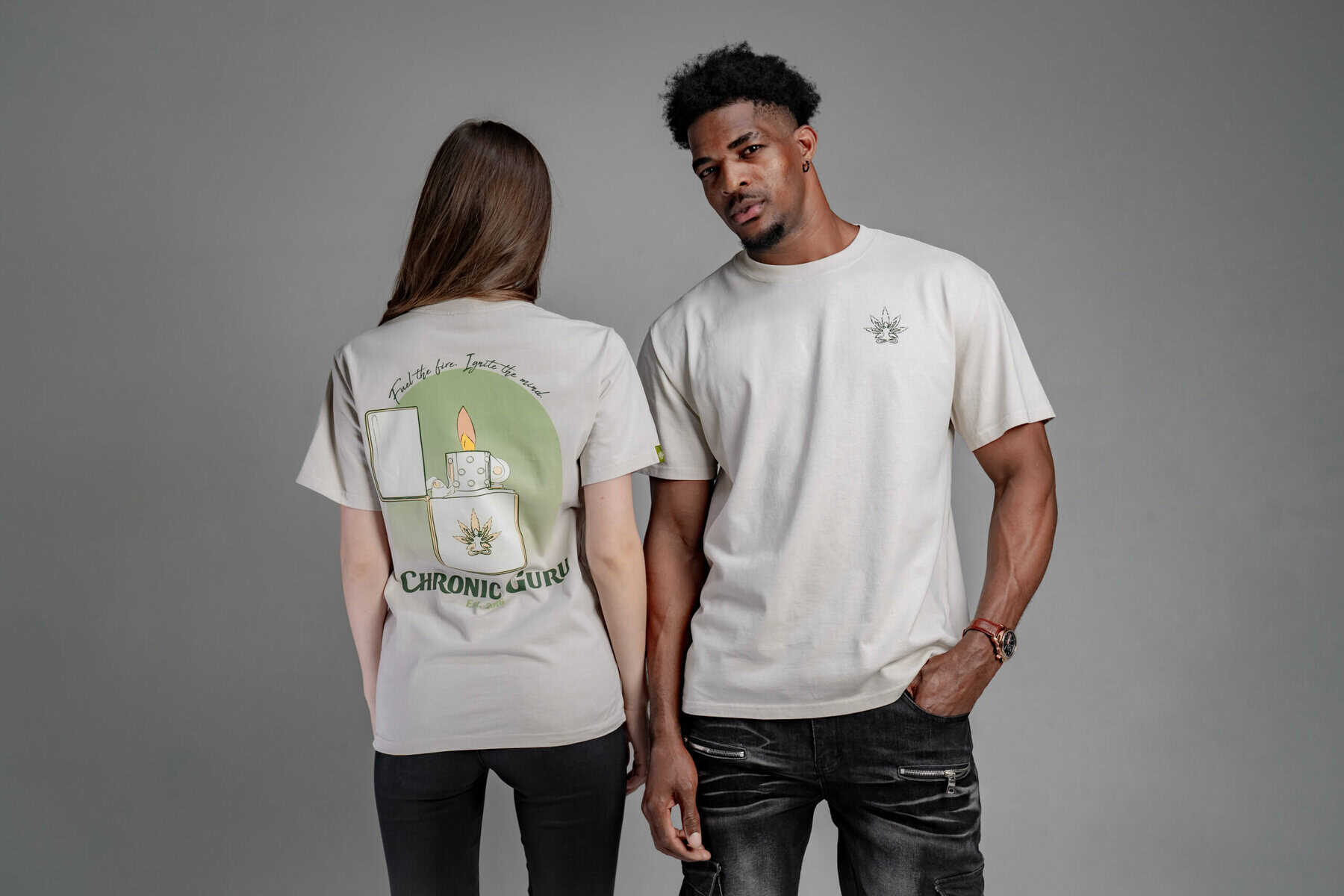 The back graphic sets the tone: a hand-drawn lighter illustration, leaf emblem, and the words Fuel the fire. Ignite the mind. It nods to ritual, reflection, and that spark of something deeper. Up front, things stay simple with a tonal leaf logo over the chest—just enough detail to feel intentional without being loud.