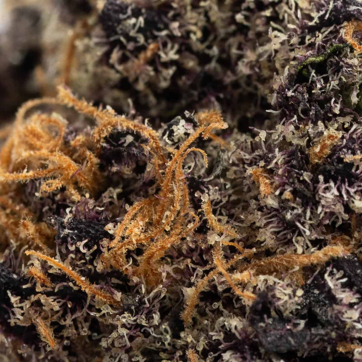 Artificial Candy cannabis features fluffy, light-green buds with streaks of deep purple and bright orange hairs. A dusting of sugary trichomes coats the surface, reinforcing its candy-inspired name and appealing look.