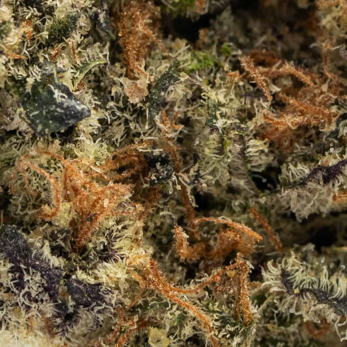 Gas Can features chunky, resin-coated buds with deep green hues and streaks of purple. Bright amber pistils weave through its frosty surface, adding contrast to its rugged and dense structure.