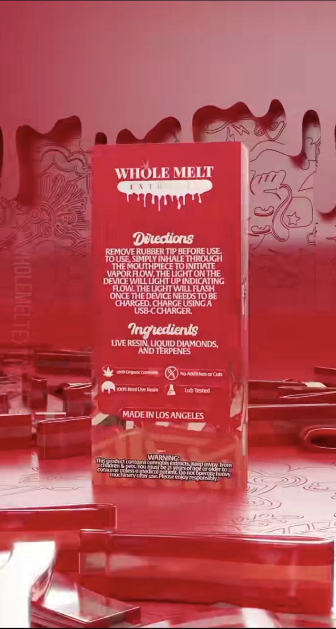 Whole melt cherry belts is an all indica cannabis Live resin, Liquid Diamonds and Terpenes,  offering a captivating flavor and a full-spectrum experience. Cherry belts live resin has a rich and enriching flavor profile, with strong notes of sweet cherries, coupled with a hint of tartness which offers a delightful sensory experience. The flavor extract has a high percentage THC of 86% and CBD of 2.3%, this flavor potency will blow off your mind from the get go so be weary of your vaping levels when consuming our products.